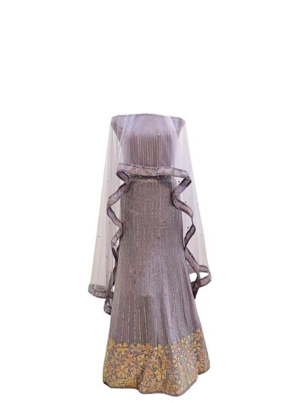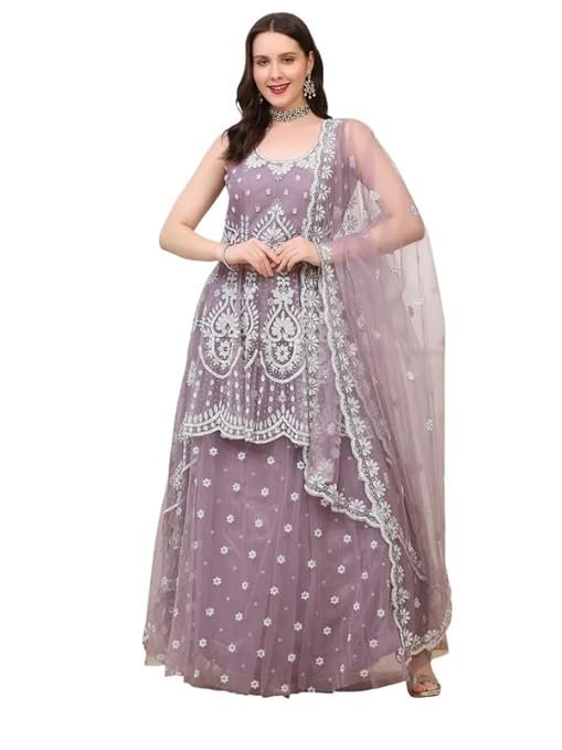 Women's Lavender Tissue Net High-Low Lehenga Set | Fish Tail Top with Pearl & White Zircon Embroidery Full Flare Skirt with Can-Can & Dupatta | Elegant Party Ensemble