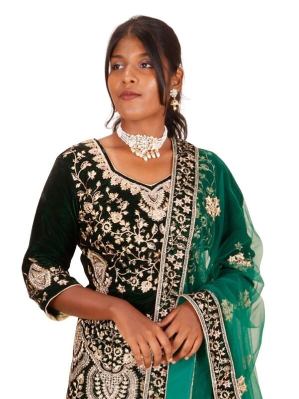 Women's Green & Black Embroidered Lehenga Set | Net Silk & Velvet | Sequin Work | Free Size | 42-Inch Flared Skirt with 7-Inch Border | 18-Inch Top Length | 228 cm Dupatta