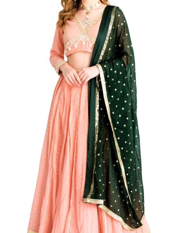 Women's Peach and Dark Green Embroidered Lehenga Choli Set, 3 Piece Contemporary Style