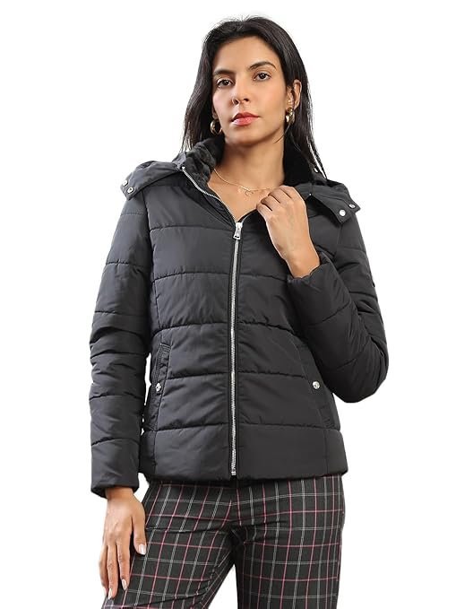 Women Mock Neck Front Zip Winter Wear Insulator Puffer Jacket With Detachable Soft Functional Hood