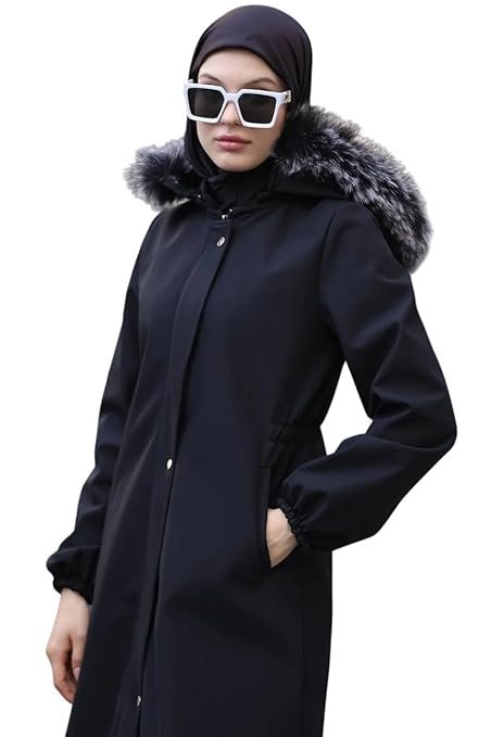 Women's Modest Long Winter Parka – Hooded Jacket with Faux Fur Trim, Drawstring Waist, and Elastic Cuffs – Full Coverage Warm Outwear