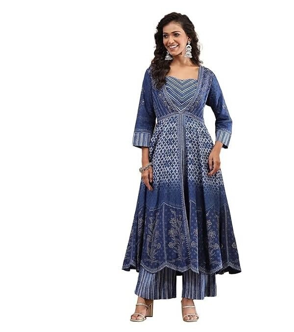 Women Cotton Blend Silk Flared Kurta Churidar Suit Set