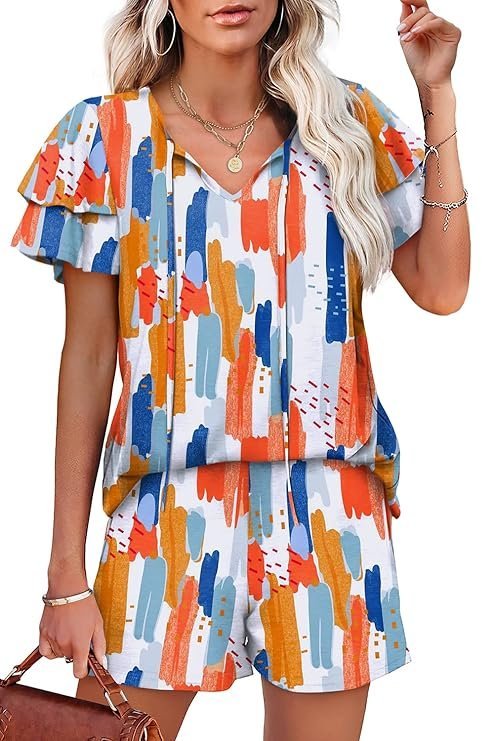 Summer Outfits for Women 2 Piece Short Sleeve V Neck Lounge Sets Casual, 2-colorful, XXL, 2-colorful, XXL