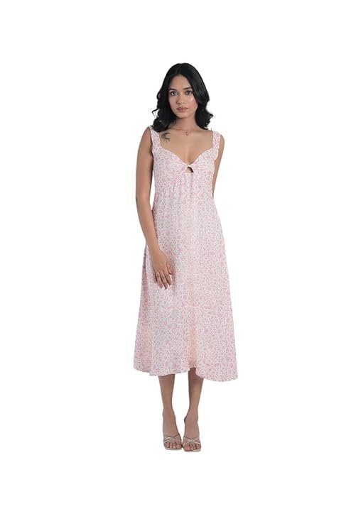 Floral Muse Fondant Pink Folk Floral Midi Dress | Cotton Satin Sleeveless V Neck Style | Printed Day Outfit for Women