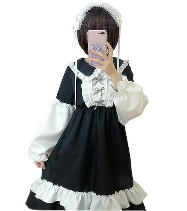 Polyester Womens Cute Maid Costumes Lolita Japanese Anime Cosplay Uniform Vintage French Maid Dress Black