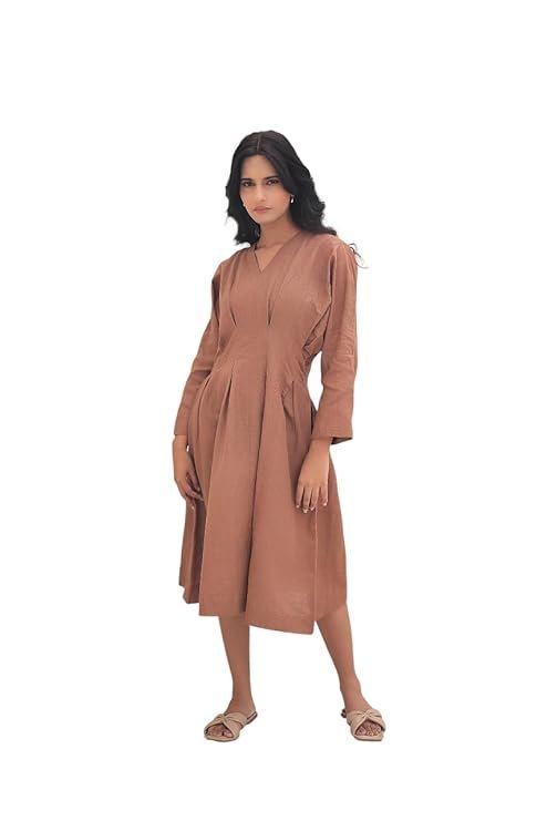 Breeze Linen Nutshell Midi Dress | Organic Linen V Neck Full Sleeve Style | Relaxed Fit Women’s Outfit
