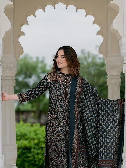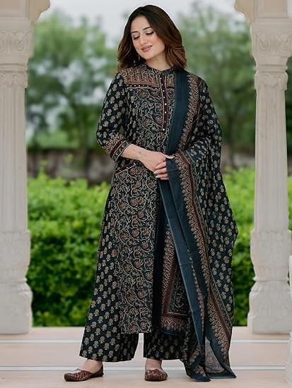 - Complete Three-Piece Set: Includes a printed straight kurta, coordinated palazzo pants, and a beautifully patterned dupatta.